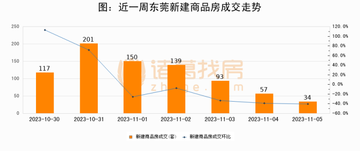 根据东莞市住房和城乡建设局数据显示,2023年11月05日东莞新建商品房成交34套,较昨日减少23套,环比下降40.4%