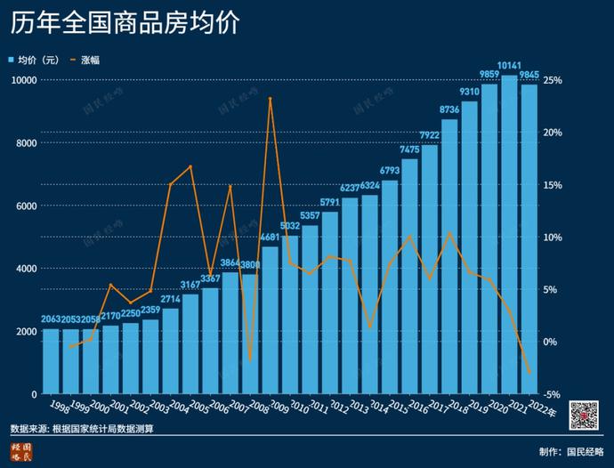 2022年一季度,全国商品房均价跌破万元大关,相比去年同期高点下降了5%以上。