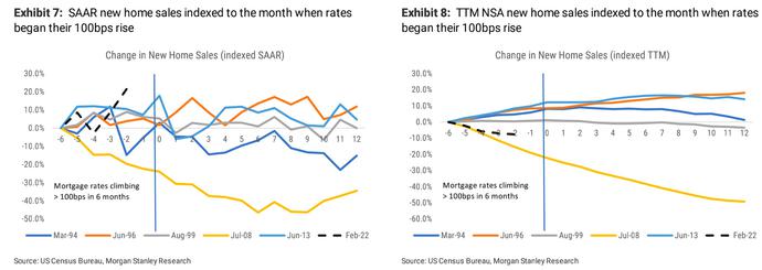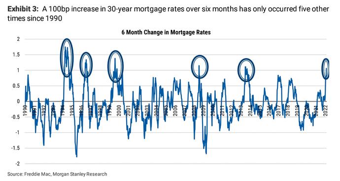 摩根士丹利分析师在此前的报告中进行了分析,大摩选取了自1990年以来,抵押贷款利率在半年内上升超过100个基点的时期,分别是1994年4月/8月、1996年6月/7月、1999年8月/10月、2008年7月和2013年6月/9月。
