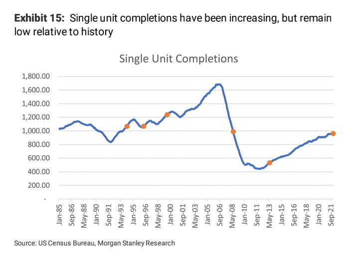从历史来看,5个时期内库存水平不一,但从未低至今天的水平。而且紧张的不仅仅是现有库存,还有新库存。房屋竣工率一直在增加,但在GFC期间后,其在2008年7月才恢复到原来的水平,之前的1992年也是如此。