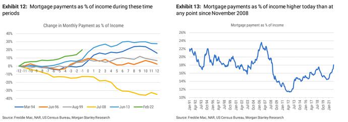 从房价来看,与房屋销售一样,房价在利率上升的六个月期间也会上涨。同时,该时期的年房价增值(HPA)往往在2-10%之间。不同的是,在2022年以来的几个月里,HPA已经接近20%。房价增长加上抵押贷款利率的大幅上升,导致购房者的每月房贷出现了少有的增长。
