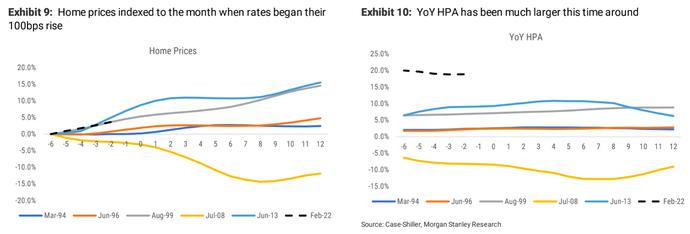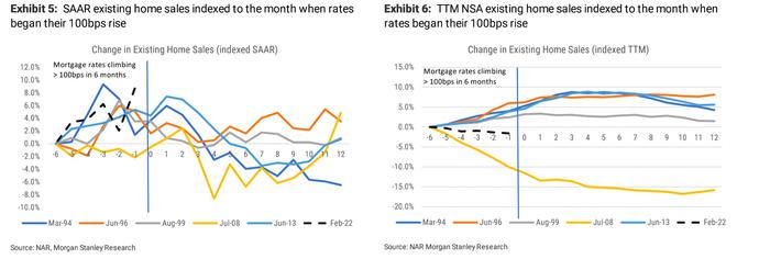 此前,摩根史丹利在报告中分析了美国房地产市场史上5个“贷款利率在半年内攀升超100个基点”时期的房价和销售情况,结合本次贷款利率走高的背景,得出: