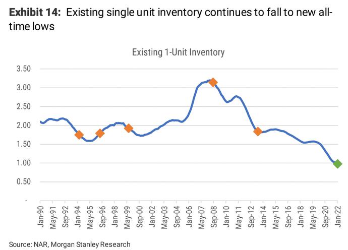 此外,正如前所述,在最初六个月之后抵押贷款利率持续上升,房屋销售将趋于疲软。考虑美联储将更激进地收紧货币政策,预计10年期美债收益率继续走高,抵押贷款利率也会跟随上涨。这也就意味着抵押贷款利率涨势还未结束,与去年相比,2022年现有住宅销售下降了6-7%。大摩预计,新房销售将更有弹性,从而推动库存增长5%左右。