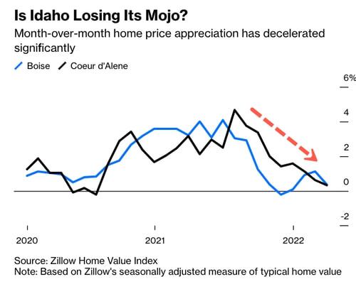 而当势头出现逆转时,首先受到冲击的是估值较高的市场。博伊西的房价正在趋于稳定,美国在线房地产公司Zillow数据显示,上个月博伊西平均房价仅上涨0.4%,远低于低于去年6月份的4.1%,成为美国100个较大住宅市场中房价较先显现出下降趋势的市场。