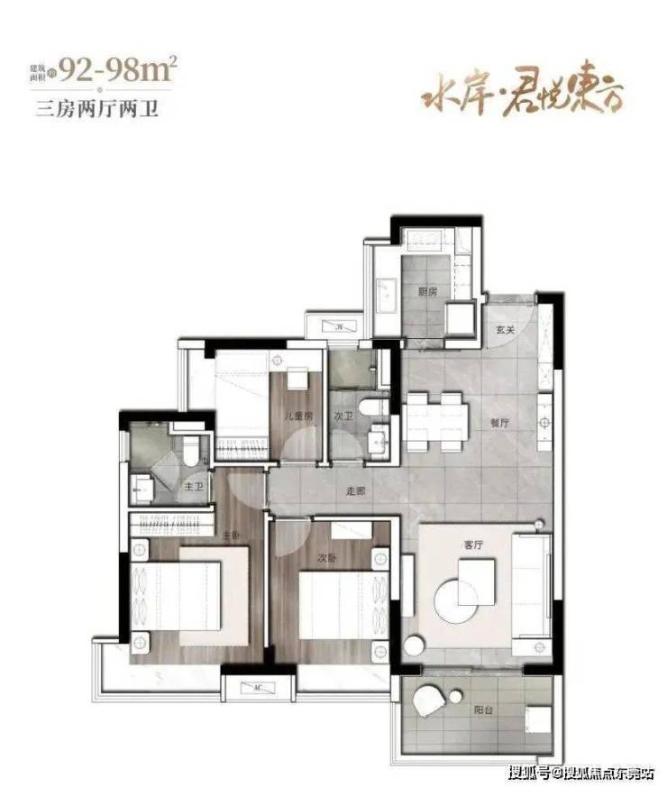 建面约92-98㎡三房户型,三开间朝南,将阳台、主卧、次卧均放在南向的位置,将观赏江景的空间布局施展到极致,随时能感受江水东流、云卷云舒,惬意的生活映入眼前。