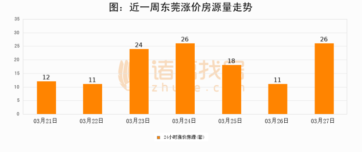 根据诸葛找房数据显示,东莞24小时涨价房源量为26套,较03月26日增加15套,环比上涨136.4%。与此同时,涨价房源占比小幅扩大,业主信心有所提升。