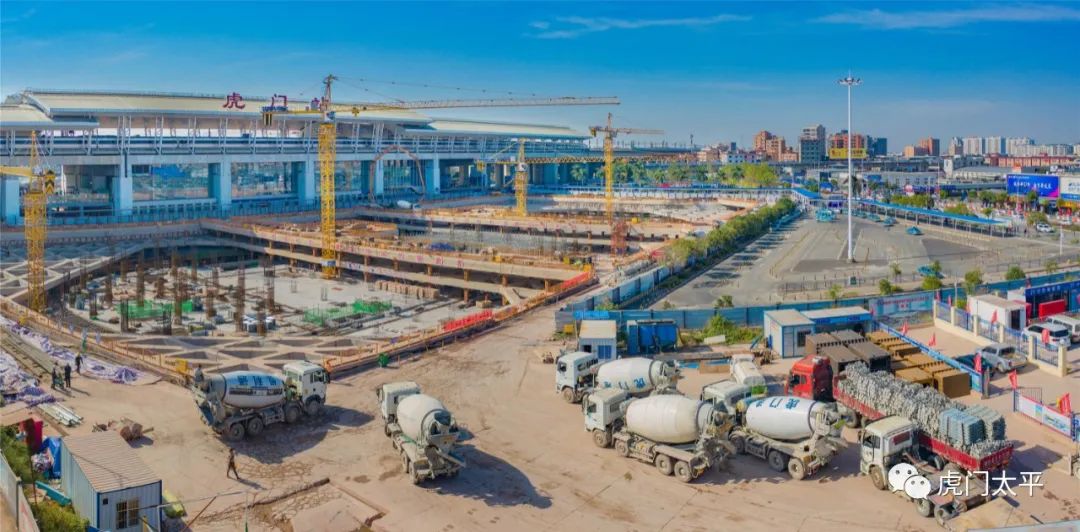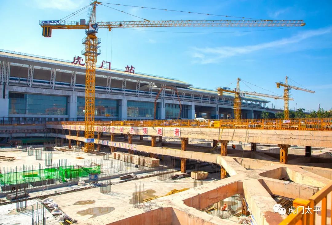 据了解,目前正在进行的是虎门高铁站市政配套工程和新建交通换乘中心工程。市政配套工程主要包含既有铁路桥梁南北侧架空平台及两层地下空间,南北地下联系通道等,总建筑面积为108806m²。目前虎门高铁站南站房、北站房扩建配套工程负二层底板已基本完工,正在进行负一层底板施工。新建交通换乘中心为东莞轨道交通2号线扩建工程,总建筑面积16555.1m²,现已进入负二层底板施工。上述两项工程以及虎门高铁站站房改扩建工程、市政道路工程等项目目前进展较为顺利,力争在2022年12月底完工投用。