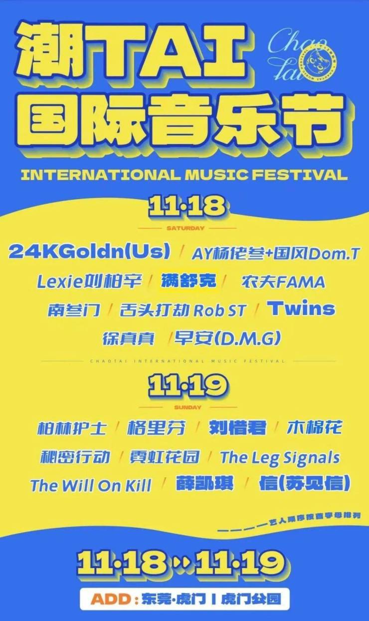 2023潮TAI国际音乐节引入国内外以及两岸三地优秀的音乐人与艺术家一起打造属于东莞的城市音乐节IP,以潮流东莞作为核心、以音乐为媒介、以艺术为形式,不仅请来了北美人气rapper 24kGolden,还有满舒克、早安、刘柏辛、徐真真等国内有名rapper以及twins、薛凯琪、信、刘惜君等共20组艺人。