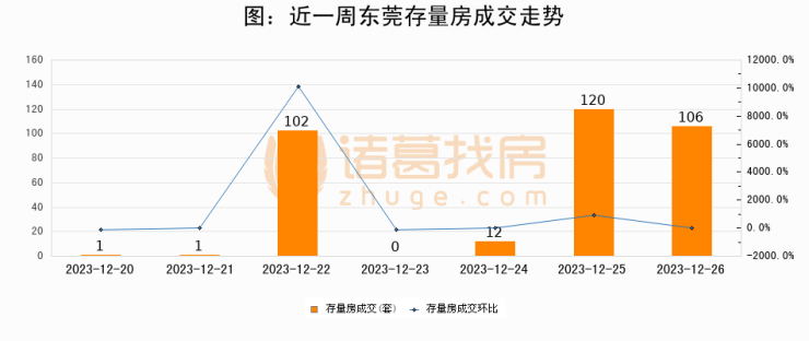 从存量房来看,2023年12月26日东莞存量房单日成交106套,比昨日减少14套,环比下降11.7%。从近一周存量房成交来看,东莞存量房日均成交套数为48套,12月26日单日成交106套,高于近一周平均水平120.8%。