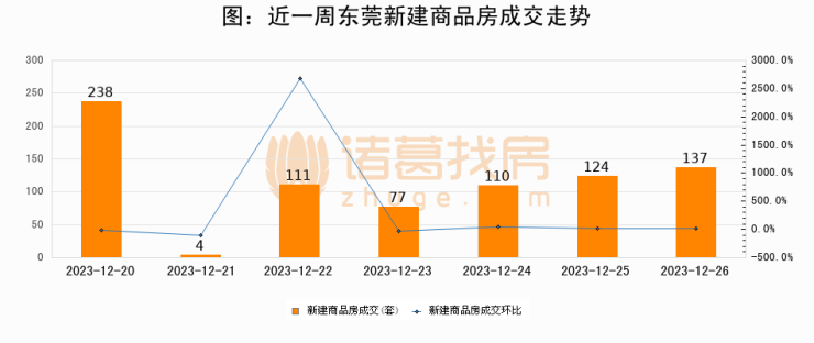 根据东莞市住房和城乡建设局数据显示,2023年12月26日东莞新建商品房成交137套,较昨日增加13套,环比上涨10.5%