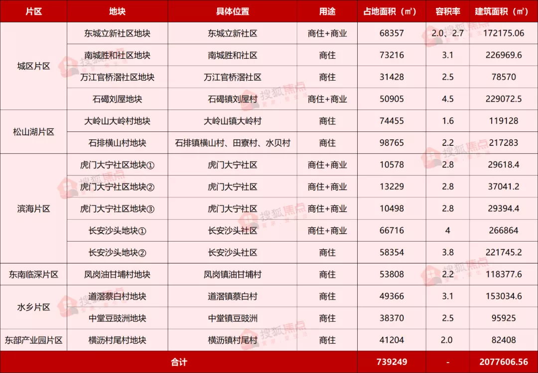 重点地块包括东城立新社区地块、南城胜和社区地块、万江官桥滘社区地块、石碣刘屋村地块、道滘蔡白村地块等。