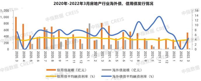 3月份,房地产企业信用债与海外债发行规模同比均大幅下降。其中,信用债发行规模为514.91亿元,环比上升78.97%,相较于去年3月811.53亿元,同比下降36.55%;内地房企海外债发行规模为25.58亿元,相较于去年3月132.53亿元,同比下降80.7%。