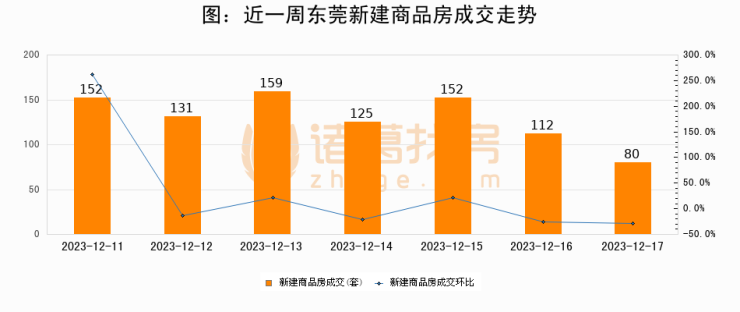 根据东莞市住房和城乡建设局数据显示,2023年12月17日东莞新建商品房成交80套,较昨日减少32套,环比下降28.6%