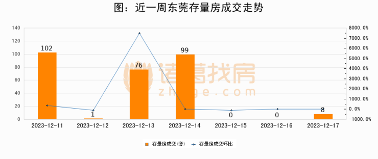 从存量房来看,2023年12月17日东莞存量房单日成交8套,比昨日增加8套,环比上涨0%。从近一周存量房成交来看,东莞存量房日均成交套数为40套,12月17日单日成交8套,低于近一周平均水平80%。