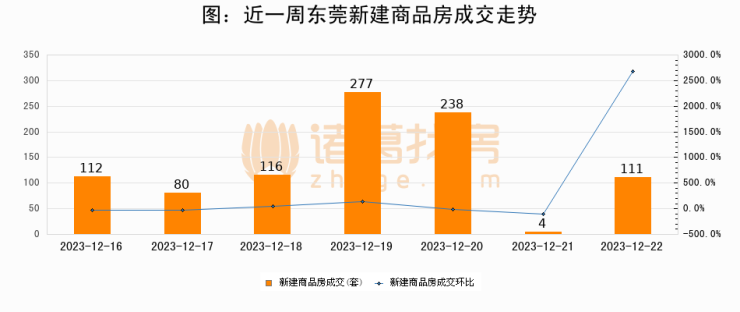 根据东莞市住房和城乡建设局数据显示,2023年12月22日东莞新建商品房成交111套,较昨日增加107套,环比上涨2675%