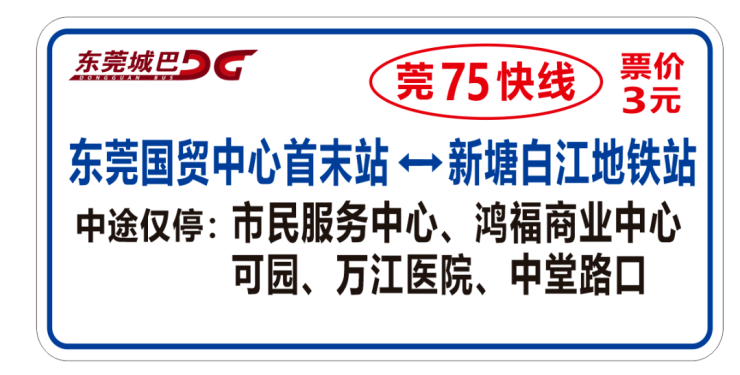 日前,东莞巴士下属城巴公司开通东莞国贸中心首末站至新塘白江地铁站的公交线路——“莞75路大站快车专线”(下文简称“莞75快线”),该快车专线与莞75路走向一致,差别在于比莞75路少停9个站。