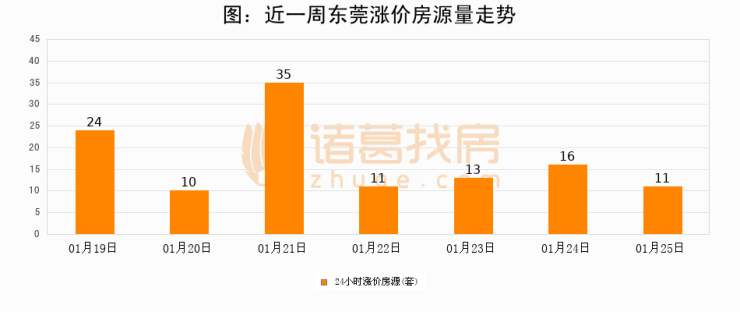 根据诸葛找房数据显示,东莞24小时涨价房源量为11套,较01月24日减少5套,环比下降31.2%。与此同时,涨价房源占比小幅回落,对于购房者来说是一个入市窗口期,购房者可抓住时机入市。