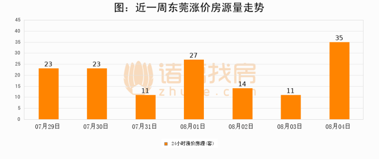 根据诸葛找房数据显示,东莞24小时涨价房源量为35套,较08月03日增加24套,环比上涨218.2%。与此同时,涨价房源占比小幅扩大,业主信心有所提升。