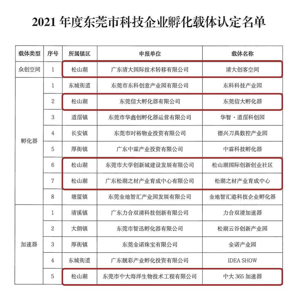 在东莞市科技局公布近期公布的2021年东莞市科技企业孵化载体名单中,位于松山湖的清大创客空间、东莞信大孵化器、松山湖国际创新创业社区、松湖之材产业育成中心以及中大365加速器入围,数量居全市首位。