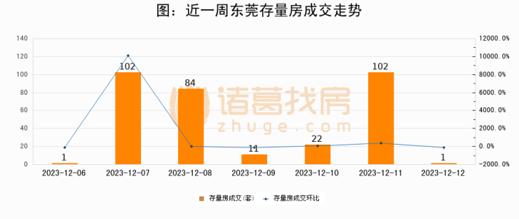 从存量房来看,2023年12月12日东莞存量房单日成交1套,比昨日减少101套,环比下降99%。从近一周存量房成交来看,东莞存量房日均成交套数为46套,12月12日单日成交1套,低于近一周平均水平97.8%。