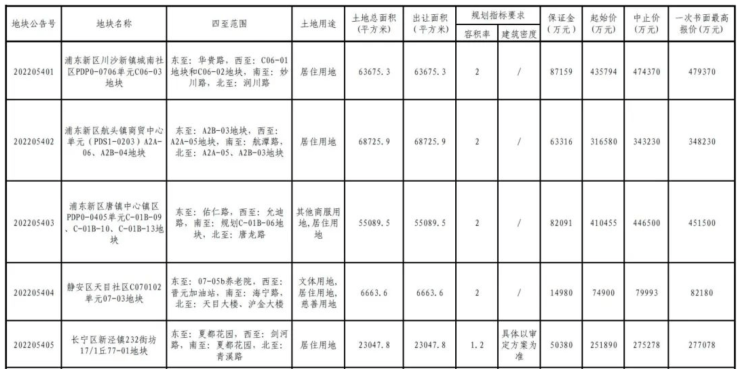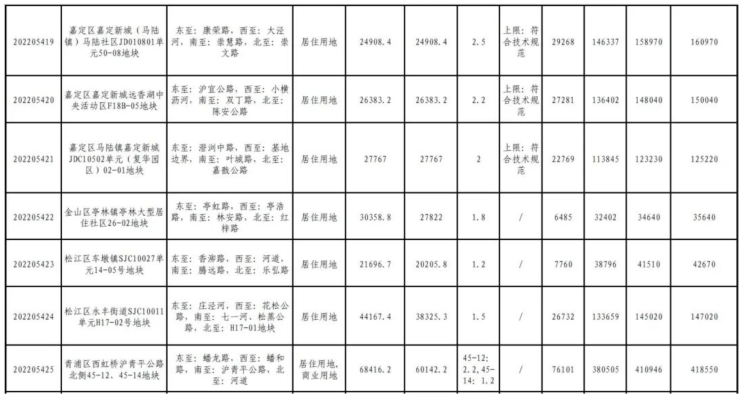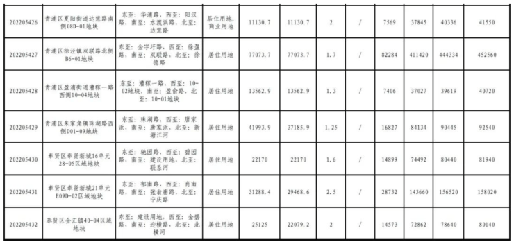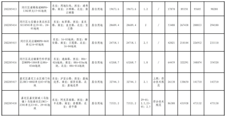 从土地面积来看,面积最大的为青浦区徐泾镇双联路北侧B6-01地块,土地面积约为7.71万平方米;面积排在第二位的是嘉定区嘉定新城(马陆镇)马陆南社区JDC1-2301单元23-01、29-01地块,土地面积约为7.35万平方米。