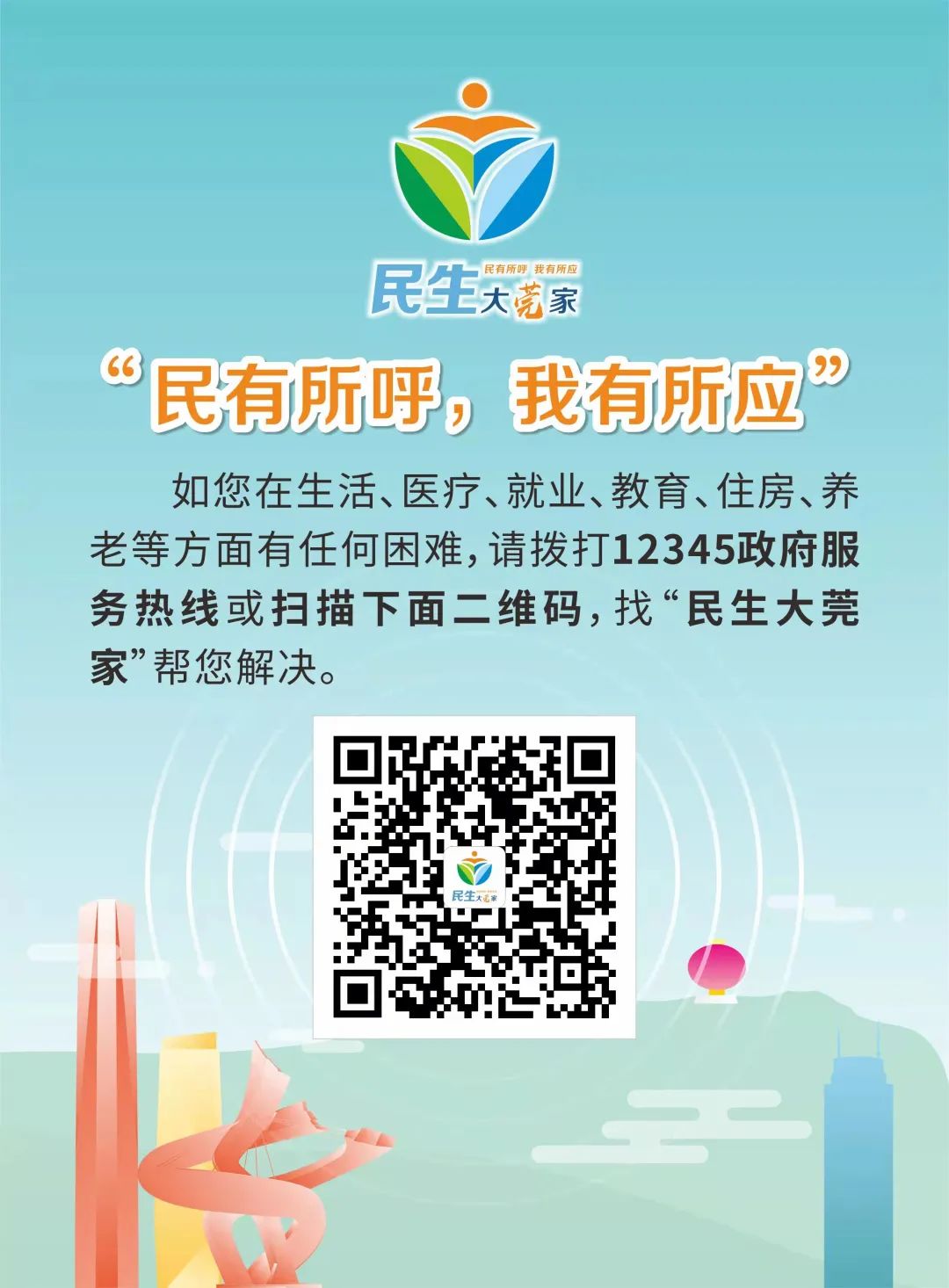 欢迎广大市民群众共同监督以上900宗“民生微实事”项目实施,如果您对改善村(社区)生活环境、关心关爱特殊群体方面有什么好的对策建议,欢迎拨打12345政府服务热线或扫描下面二维码,找“民生大莞家”为您解决,或许下一个“民生微实事”就在您的家门前!