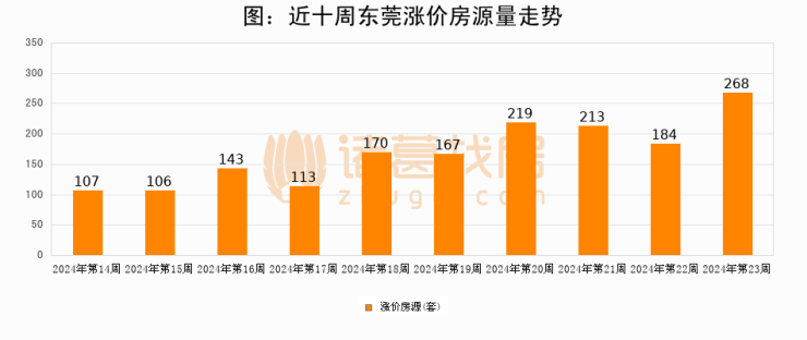 从调价房源来看,第23周东莞涨价房源268套,较上周上涨45.7%。与此同时,23周涨价房源占比提升0.05个百分点,业主信心持续恢复。