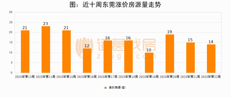 从调价房源来看,第22周东莞涨价房源14套,较上周下降6.7%。与此同时,22周涨价房源占比回落1.17个百分点,业主信心小幅波动,购房者可则需入市。