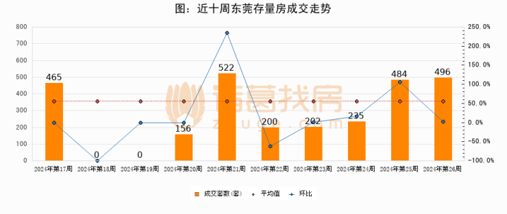 存量房方面,第26周东莞存量房成交496套,较上周增加12套,环比上涨2.5%。从近十周成交走势来看,周均成交套数为276套,本周高于平均水平79.7%。