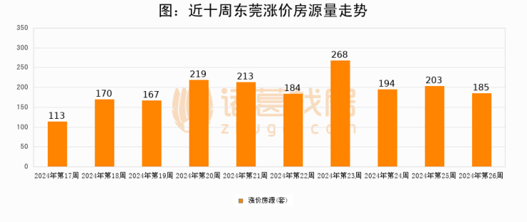 从调价房源来看,第26周东莞涨价房源185套,较上周下降8.9%。与此同时,26周涨价房源占比回落3.31个百分点,业主信心小幅波动,购房者可则需入市。