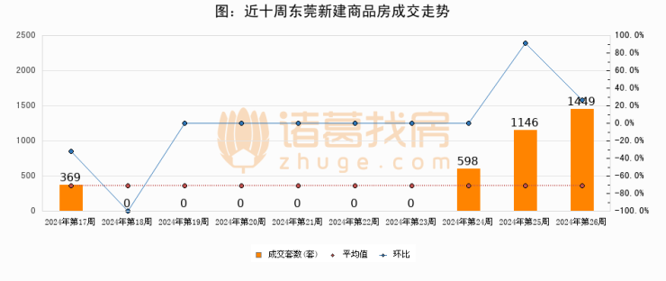 进入2024年第26周(06月24日-06月30日),东莞新建商品房成交1449套,较上周增加303套,环比上涨26.4%。从近十周成交来看,周均成交套数为356套,本周成交1449套,高于近十周平均成交量307%。