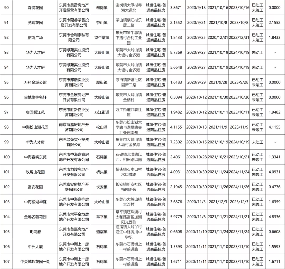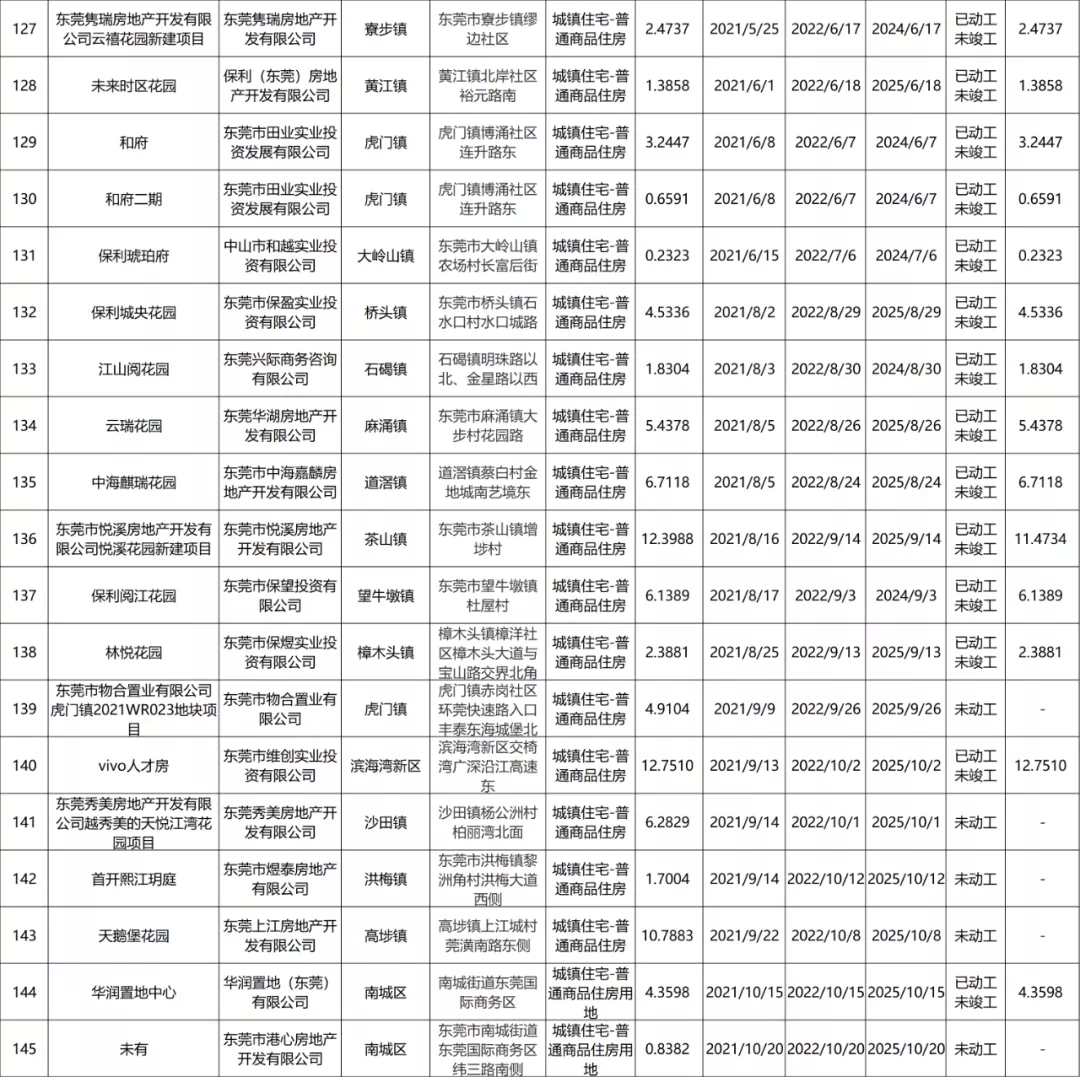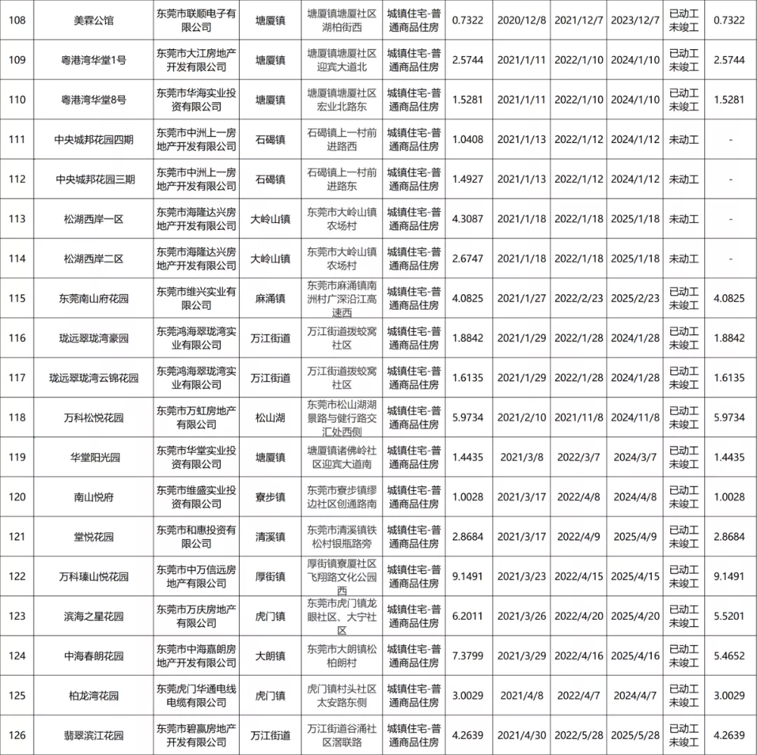 近日,东莞自然资源局发布《东莞市存量住宅用地项目信息》,据公布数据显示,东莞目前存量住宅用地项目有147个,存量住宅用地总面积为575.44万㎡(注:1公顷=1万㎡)。 其中,未动工土地面积134.86万㎡,已动工未竣工土地面积为440.58公顷,未销售房屋的土地面积为54.59万㎡。 在东莞此次发