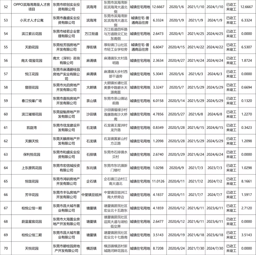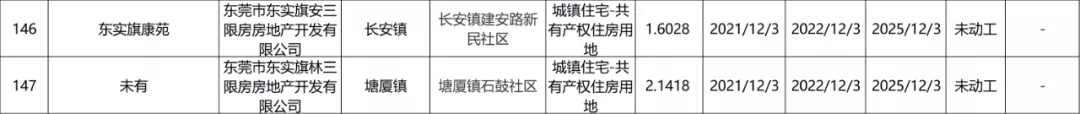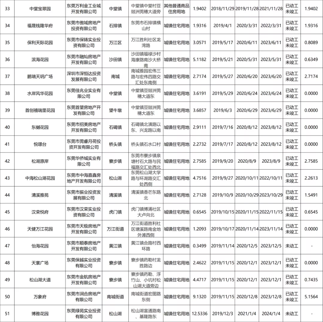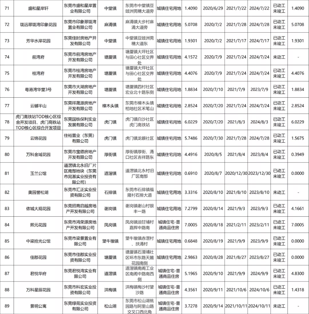 近日,东莞自然资源局发布《东莞市存量住宅用地项目信息》,据公布数据显示,东莞目前存量住宅用地项目有147个,存量住宅用地总面积为575.44万㎡(注:1公顷=1万㎡)。 其中,未动工土地面积134.86万㎡,已动工未竣工土地面积为440.58公顷,未销售房屋的土地面积为54.59万㎡。 在东莞此次发
