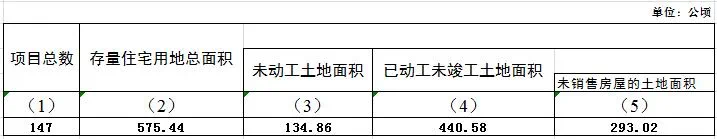 其中,未动工土地面积134.86万㎡,已动工未竣工土地面积为440.58公顷,未销售房屋的土地面积为54.59万㎡。
