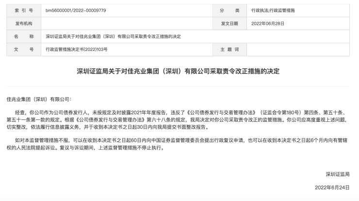 6月28日,深圳证监局发布关于对佳兆业集团(深圳)有限公司采取责令改正措施的决定:经查,佳兆业集团(深圳)有限公司作为公司债券发行人,未按规定及时披露2021年年度报告,违反了《公司债券发行与交易管理办法》(证监会令第180号)第四条、第五十条、第五十一条第一款的规定。根据《公司债券发行与交易管理办法》第六十八条的规定,深圳证监局决定对佳兆业集团(深圳)有限公司采取责令改正的监管措施。佳兆业集团(深圳)有限公司应高度重视上述问题,切实整改,依法履行信息披露义务,并于收到本决定书之日起30日内向深圳证监局提交书面整改报告。