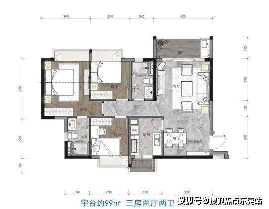 项目共开5幢,主力户型为79㎡两房、99-102㎡三房、125-133㎡四房。项目户型均为两梯四户,产品覆盖了市场上主流的3-4房产品。户型朝向正南偏东,通透采光,南北通风,格局方正。