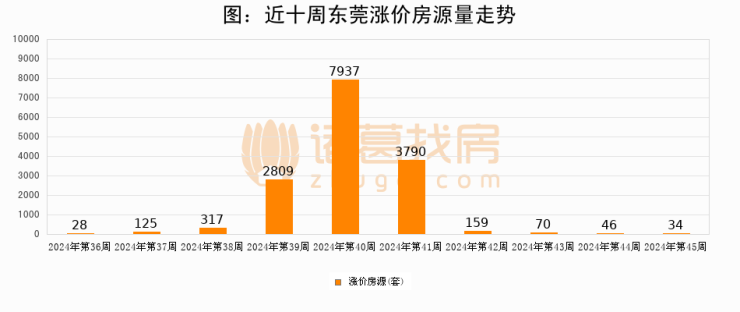 从调价房源来看,第45周东莞涨价房源34套,较上周下降26.1%。与此同时,45周涨价房源占比回落1.48个百分点,业主信心小幅波动,购房者可则需入市。