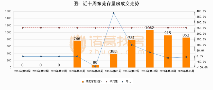 存量房方面,第45周东莞存量房成交852套,较上周减少63套,环比下降6.9%。从近十周成交走势来看,周均成交套数为482套,本周高于平均水平76.8%。