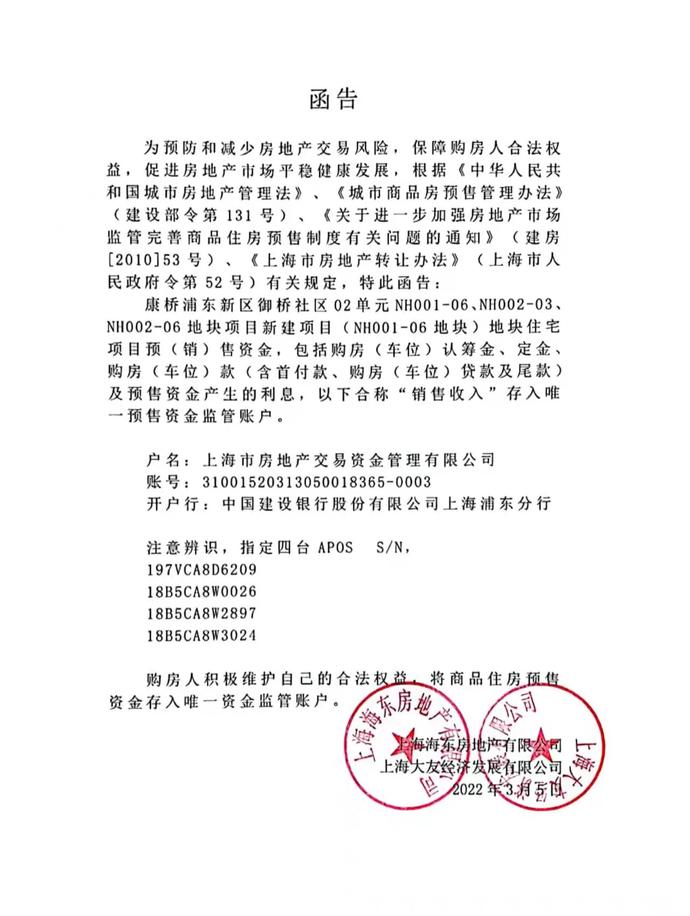 近期,御桥博翠官方微信号发布《函告》,称该盘的销售收入将存入少有预售资金监管账户——上海市房地产交易资金管理有限公司,后者是上海市房地产交易中心搭建并指定的存量房交易资金监管平台。