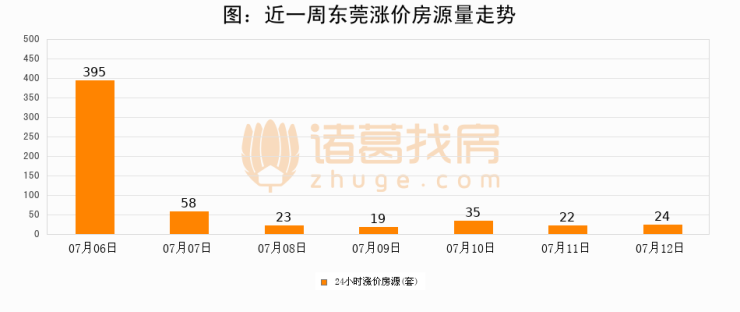 根据诸葛找房数据显示,东莞24小时涨价房源量为24套,较07月11日增加2套,环比上涨9.1%。与此同时,涨价房源占比小幅扩大,业主信心有所提升。
