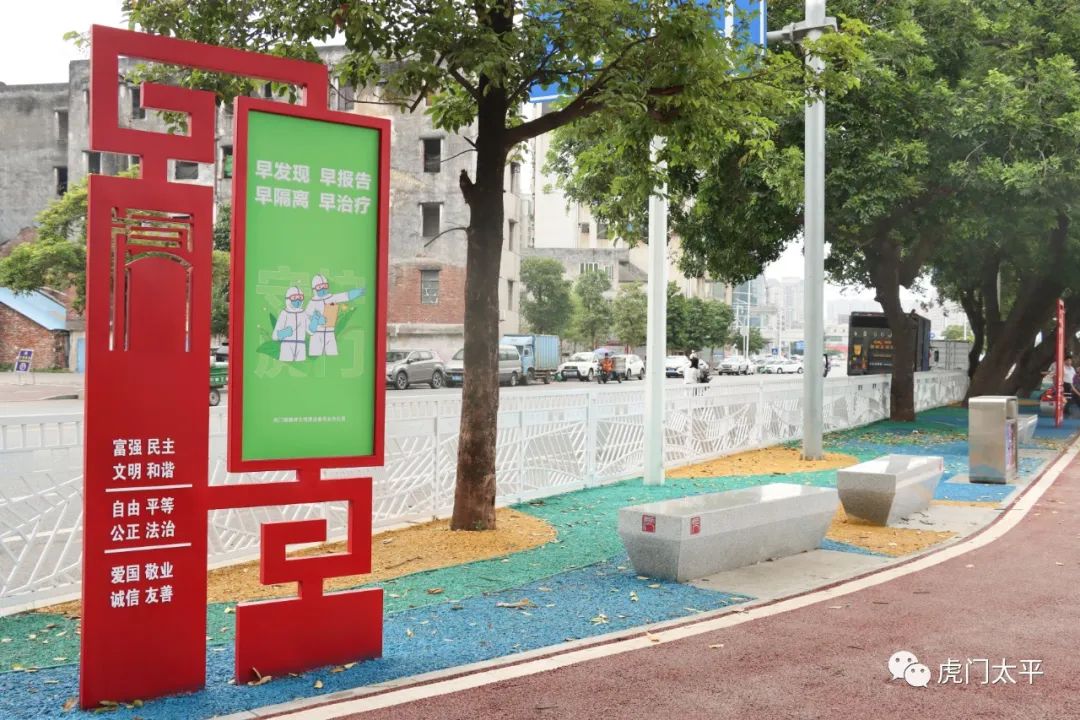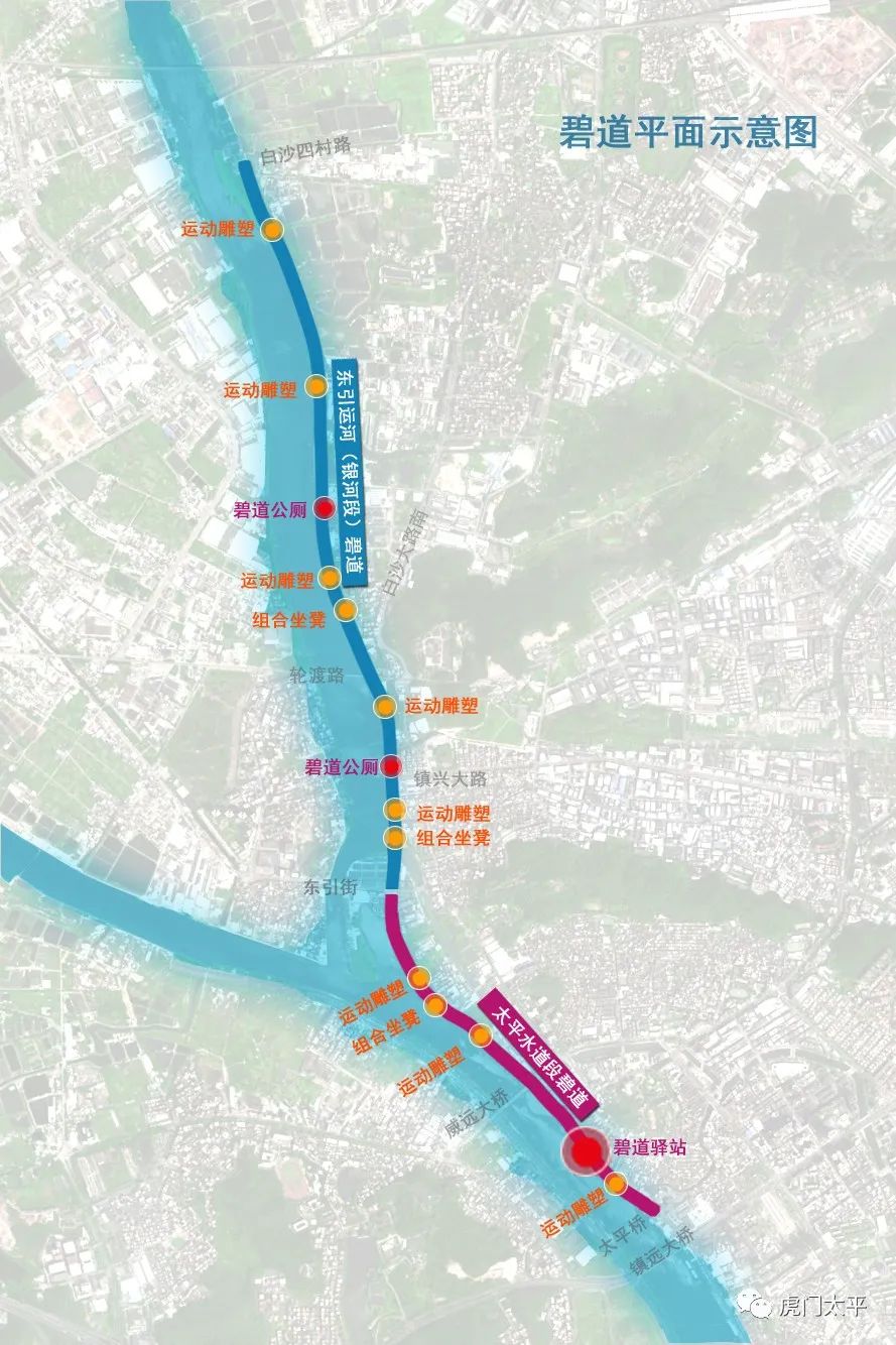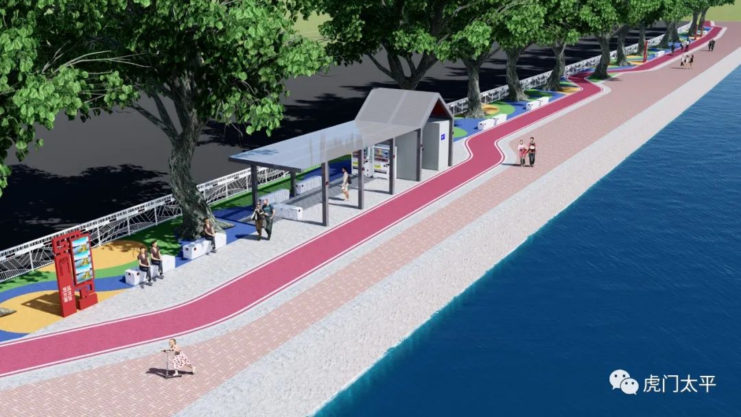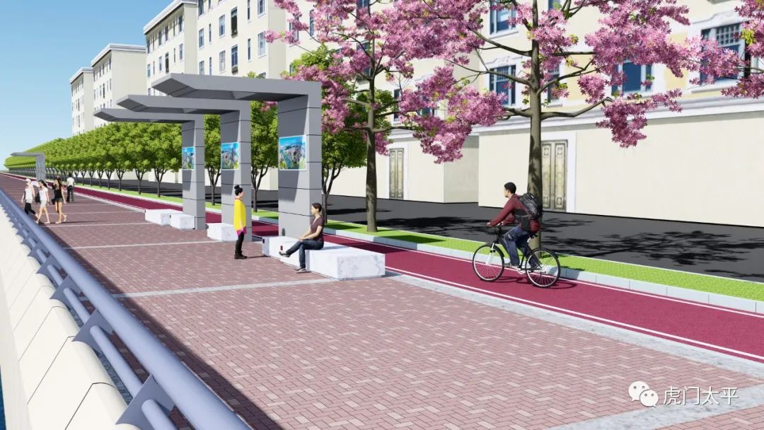 碧道集生态、文化、景观、休闲等功能于一体。项目建成后,完整的自行车骑行道促使人车分流,将给市民带来更好的骑行体验。另外,在人流量密集位置设置的碧道驿站、休息坐凳等配套服务设施,能让市民在运动健身期间有舒适的休息空间。在文化宣传方面,碧道设置了文化宣传栏、宣传牌等,用于宣传虎门的特色文化,彰显出虎门历史文化底蕴。碧道沿线放置各种运动雕塑,用造型新颖且亮丽的雕塑,增强碧道运动休闲健身的氛围。