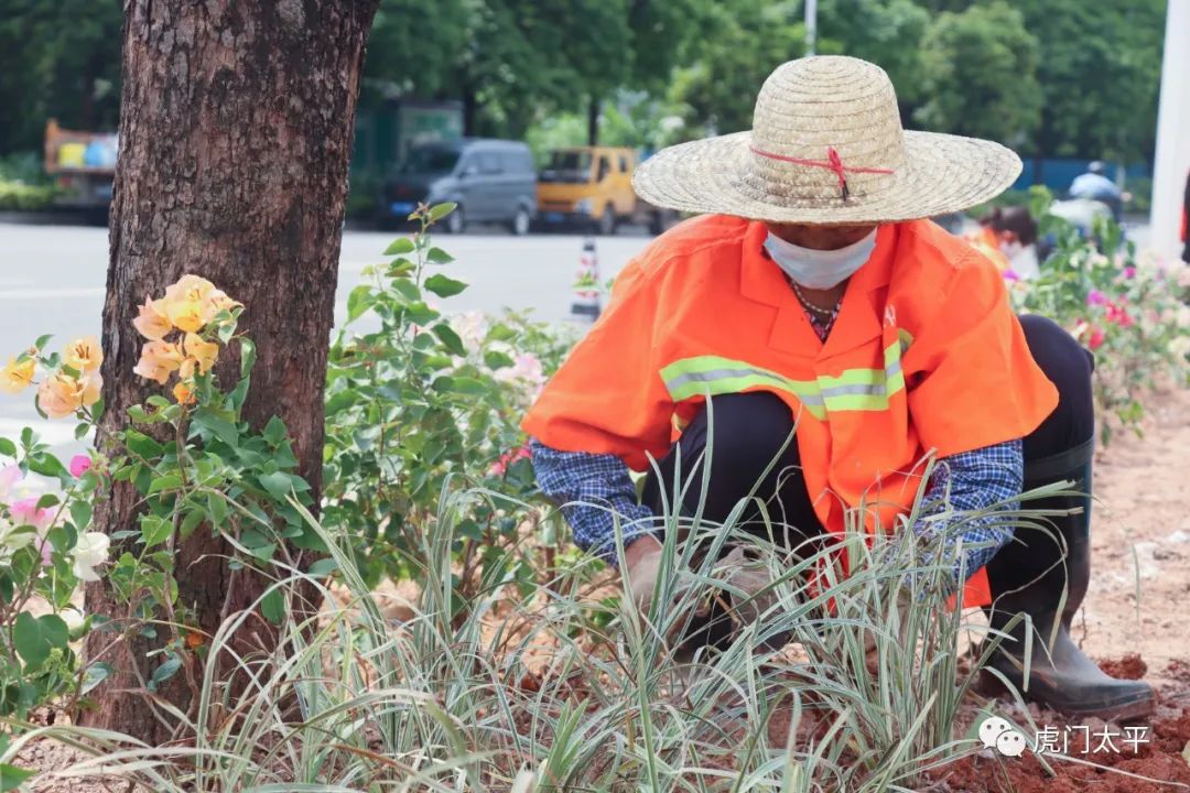 在东引运河(银河段)碧道工程项目现场,施工人员在绿化带上,按照提前画好的种植范围,认真种植花草等绿化植物。