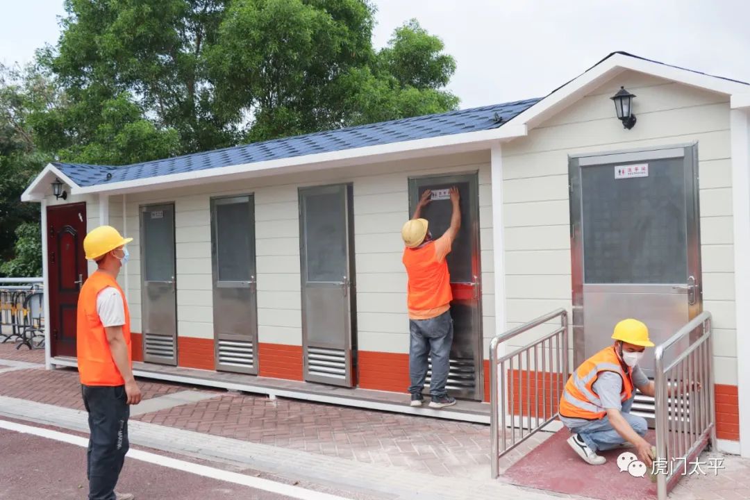 在太平水道碧道工程项目现场,施工人员正忙着对设于该处的碧道驿站进行整修。他们分组施工,有的清理墙面和钢结构横梁上的污迹,有的填充厕所墙面瓷砖间的缝隙,有的整理驿站内摆放的施工材料,为下一步的施工做好准备。