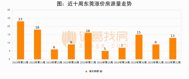 从调价房源来看,第32周东莞涨价房源13套,较上周上涨44.4%。与此同时,32周涨价房源占比提升3.11个百分点,业主信心持续恢复。
