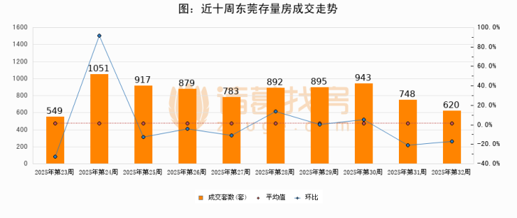 存量房方面,第32周东莞存量房成交620套,较上周减少128套,环比下降17.1%。从近十周成交走势来看,周均成交套数为827套,本周低于平均水平25%。