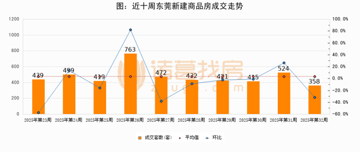 进入2025年第32周(08月04日-08月10日),东莞新建商品房成交358套,较上周减少166套,环比下降31.7%