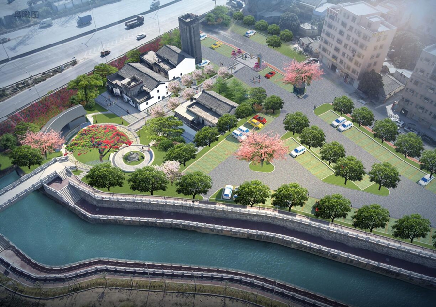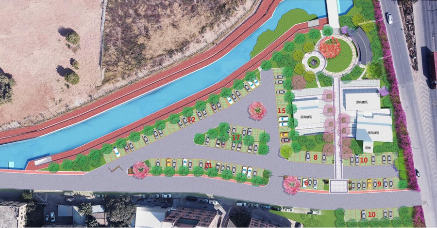 据介绍,该项目总投资近400万元,设计面积约7606平方米,通过以钥匙为设计主题,结合客家文化和项目场地需求,新建2个圆形休闲广场,设置客家戏剧景墙、客家文化小品、碉楼等客家文化元素,寓意打开客家文化之门。同时,规划生态停车位128个,配置公共洗手间、线路指引牌等设施。