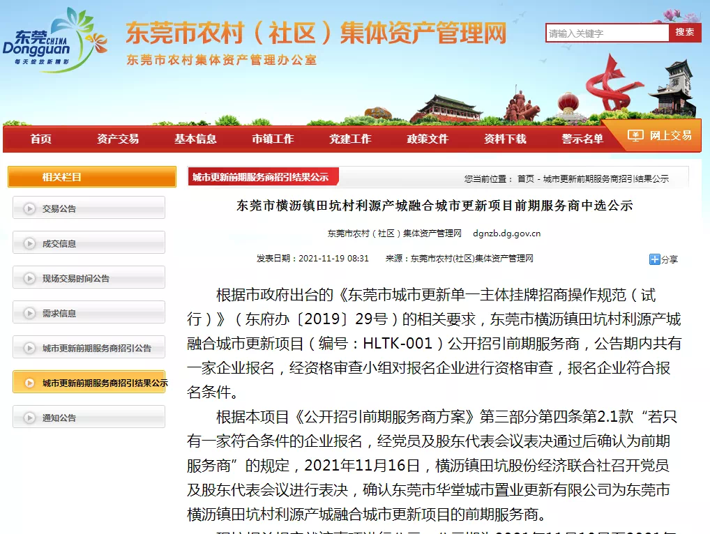 近日,东莞市农村(社区)集体资产管理网发布“东莞市横沥镇田坑村利源产城融合城市更新项目前期服务商中选公示”。据该“公示”,确认东莞市华堂城市置业更新有限公司为东莞市横沥镇田坑村利源产城融合城市更新项目的前期服务商。