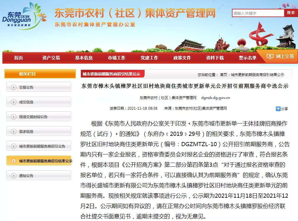 近日,东莞市农村(社区)集体资产管理网发布“东莞市樟木头镇樟罗社区旧村地块商住类城市更新单元公开招引前期服务商中选公示”。据该“公示”,确认东莞市得长盛城市更新有限公司为东莞市樟木头镇樟罗社区旧村地块商住类更新单元的前期服务商。