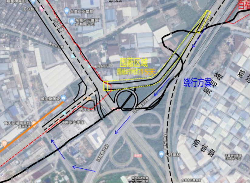 2.黄色虚线为本次施工需封闭环城北路辅道下莞穗路G107国道往中堂方向;